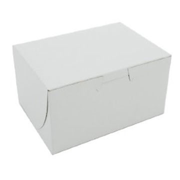 White Non-Window Bakery boxes are made of clay-coated kraft paperboard, which is white on the outside and brown on the inside. Each one piece box has an attached tuck-in lid, and can be used to hold and carry a variety baked goods. The lock corners facilitate assembly and enable the box to be folded flat for storage or transport. The clay-coated exterior can be custom printed with a logo or a business name. Paperboard is thicker and more rigid than paper and can be recycled or composted.